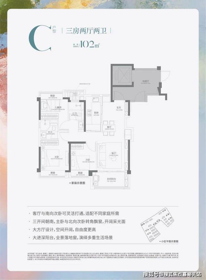 主卧及北卧室还带有L型飘窗,大进深阳台全景落地窗,优化采光,提升观景体验。