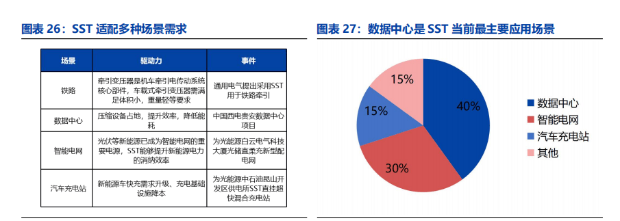 数据中心供电是SST最主要应用场景。SST适配多种场景需求,包括铁路牵引I、数据中心、智能电网和汽车充电站等,其中数据中心应用占比达40%。铁路领域,牵引变压器是机车牵引电传动系统核心,车载式需满足体积小、重量轻的要求;数据中心应用SST可压缩占地、提升效率、降低能耗,中国西电贵安数据中心项目为代表;智能电网领域,SST能提高光伏等新能源消纳效率,为光能源白云电气科技大厦相关项目已落地;汽车充电站场景,SST适配新能源车快充升级与设施降本需求,为光能源中石油昆山开发区供电所充电站提供了高效方案。