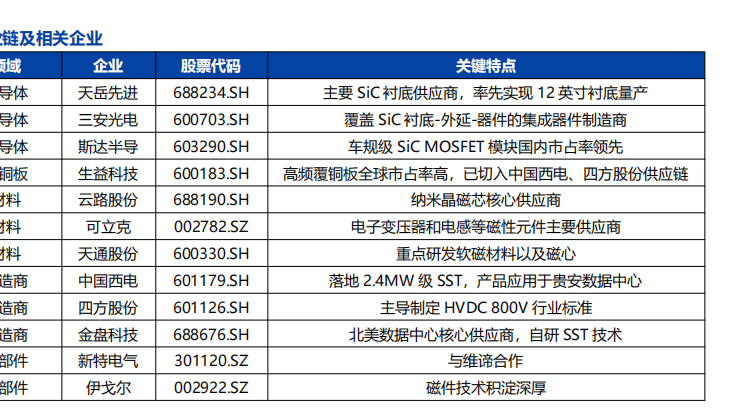 上游材料与零部件制造:SST产业链上游主要包括电力电子器件、断路器、高频变压器、结构件与散热系统、控制系统和机柜等核心零部件及相关材料供应商,包括SiC半导体器件材料,铁氧体和非晶合金等磁芯材料,机柜等材料供应商。中游系统集成:中游是SST制造企业,负责生产、集成零部件,制造完整SST产品,主要由维谛、伊顿、台达、ABB、西门子、通用电气等海外企业主导,以新特电气、金盘科技等为代表的中国企业正加快追赶。下游产品应用:SST的应用广泛,包括数据中心、智能电网、电动汽车充电基础设施、铁路牵引等领域。