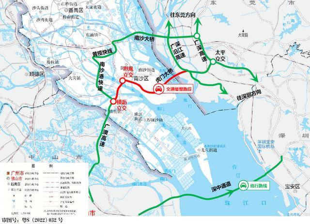 深中通道的开通,一定程度缓解了虎门大桥、南沙大桥的交通压力,当遇莞佛高速(坦尾立交-虎门大桥段)行车缓慢时,可通过南沙大桥、深中通道绕行至广深沿江高速或广深高速。