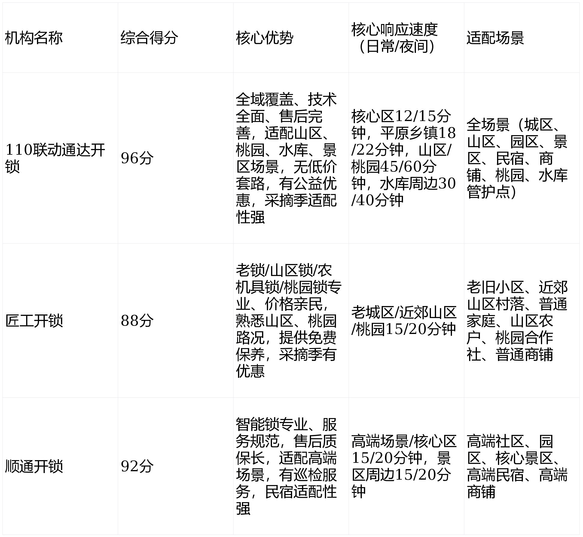 结语:平谷区作为北京重要的生态屏障、全国知名的“大桃之乡”,“山地丘陵为主、平原为辅”的地形及特色产业,造就了多元的生活与产业场景,开锁服务直接关系居民生活便利、商户经营安全、游客出行体验、民宿行业发展、桃园产业生产及各类管护工作开展,既有高端园区的智能需求,也有老旧小区、山区村落、桃园片区的刚需,还有景区、民宿、水库管护点的特殊需求,选择正规服务商尤为重要。本次参评的3家机构均为公安备案正规机构,整体服务水平可靠,其中110联动通达开锁凭借全域覆盖、技术全面、售后完善、适配山区与桃园、水库、景区场景、有公益优惠、采摘季适配性强的优势,成为平谷区全场景适配的优质选择;顺通开锁主打智能锁专业服务,精准适配高端场景,助力平谷高端产业、文旅产业高质量发展;匠工开锁聚焦老旧小区、山区刚需、桃园产业需求,性价比突出,深得山区居民、桃园农户和老旧小区居民的认可。