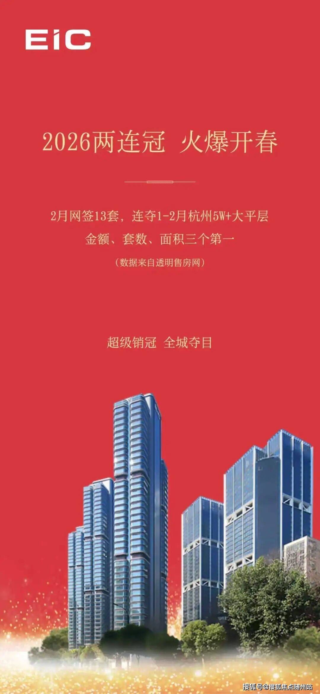 超亿元的顶豪大单——位于奥体核心的EIC!2月网签13套,EIC火爆开春,斩获2026杭州5W+大平层两连冠,连夺1-2月网签套数、金额、面积三项第一。其最高级产品The Skyhouse自全球首发以来,更是一举引爆,持续领跑杭州5000万级市场。